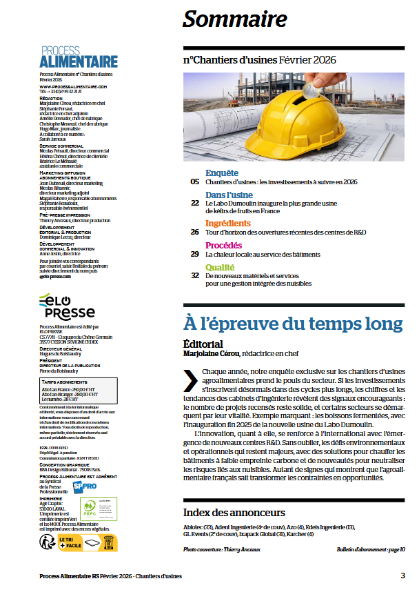 Fidèle à une ligne éditoriale qui a fait sa renommée, Process Alimentaire propose des contenus aussi bien axés sur des problématiques stratégiques ou transversales du secteur agroalimentaire que centrés sur des solutions techniques en ingrédients, procédés, emballage ou qualité. Au travers d'enquêtes, de reportages en usines et d'avis d'experts, les journalistes spécialisés de la rédaction de Process Alimentaire décryptent l'actualité et mettent en perspective les enjeux du secteur.